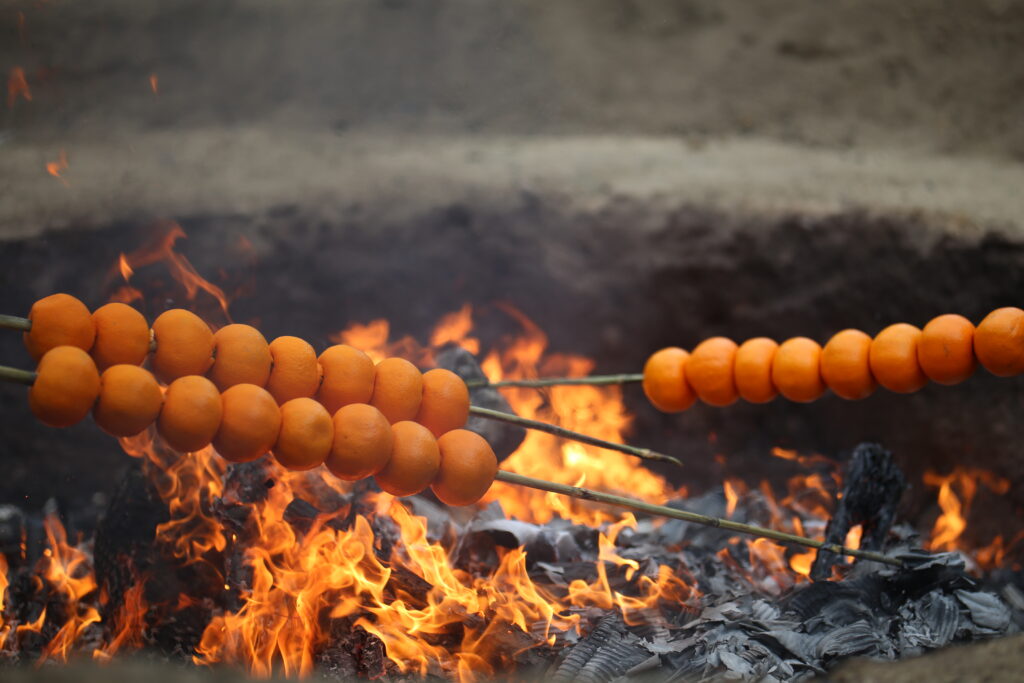 弘化年間より続く伝統の神事で、古いお札や神棚、人形などを神昇神事の後にお焚き上げし、その忌火でみかんを焼きます。忌火で焼いたみかんを食べると、一年間風邪をひかず、元気に過ごせるといわれております。健康を願い、ぜひおみかんをお召し上がりいただければ。