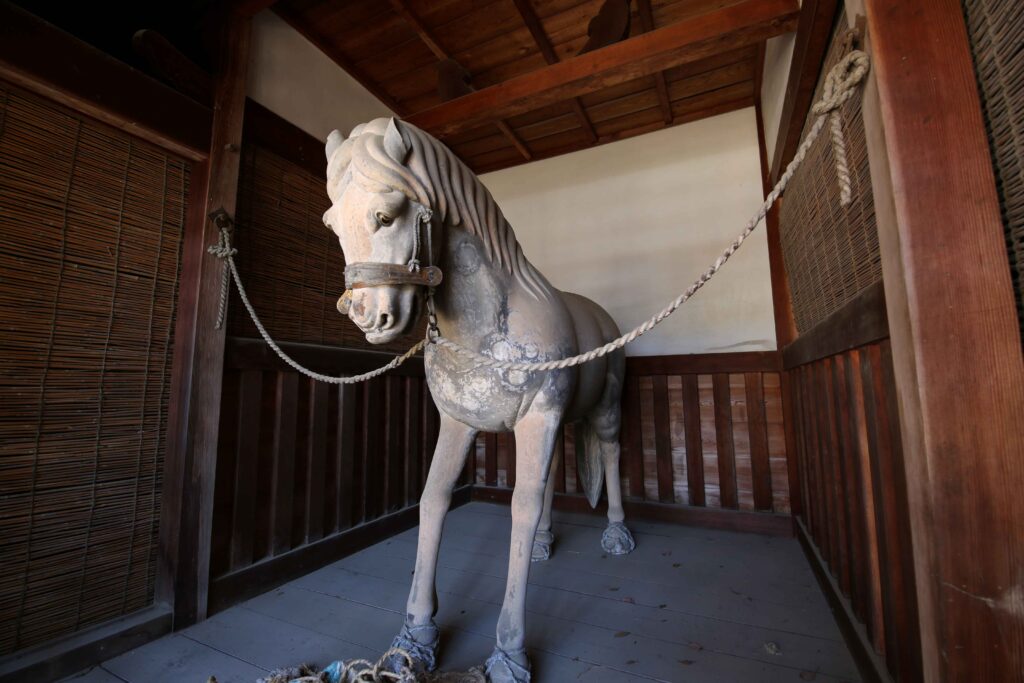 奉納から数年後、神馬が御厩を抜け出し、近くの田畑を荒らしたと伝えられています。そこで神社が高松藩へ届け出を行い、以後は口輪をはめ、綱で両側からつないでおくようになったといいます。動くはずのない木造の神馬ですが、現在も厩につながれたまま祀られております。
