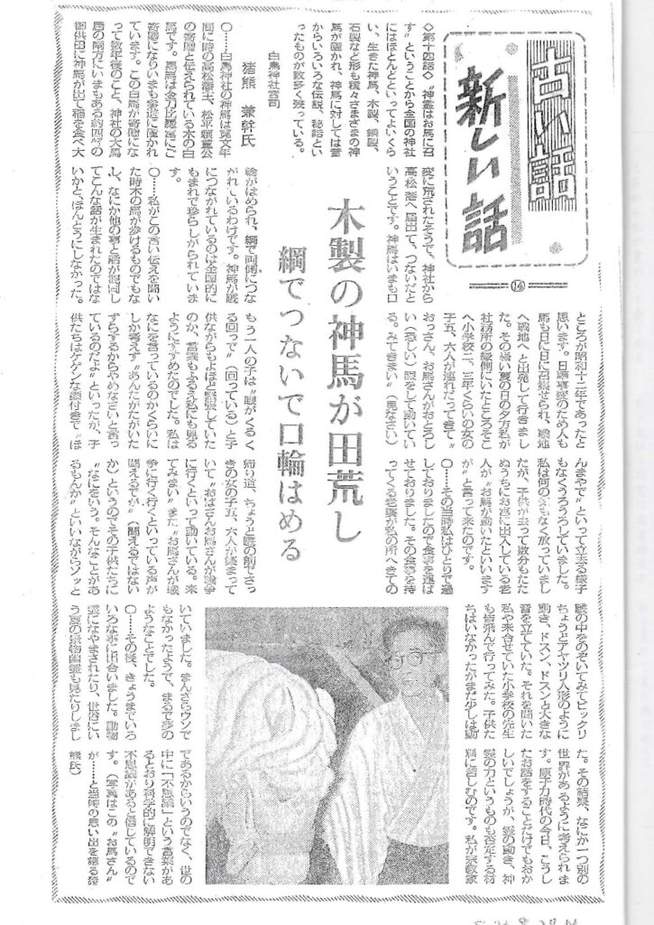 昭和12年頃、当時の宮司のもとに近所の子どもたちが「神馬が動いている」「目が回っている」と知らせに来たことがありました。厩をのぞいた人々は、木の馬がまるで操り人形のように揺れ、大きな音を立てているのを目撃したと伝えられています。この不思議なお話は、昭和34年の新聞記事にも紹介されております。