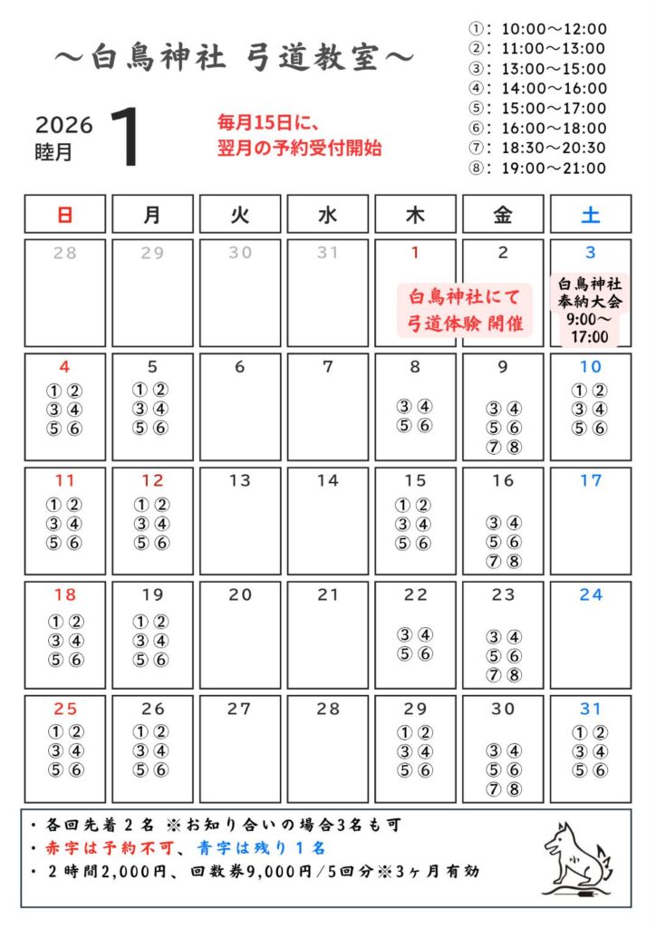 白鳥神社弓道場では「日本の弓矢をもっと身近に」を目的に、初心者向けの弓道教室を開催しております。初めて弓を持つ方でも、5回の参加で本格的な距離から弓を引け、弓道を行うことができる弓道教室です。武芸上達の神様の下で、心ととのう弓を習ってはいかがでしょうか。